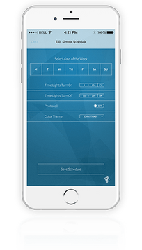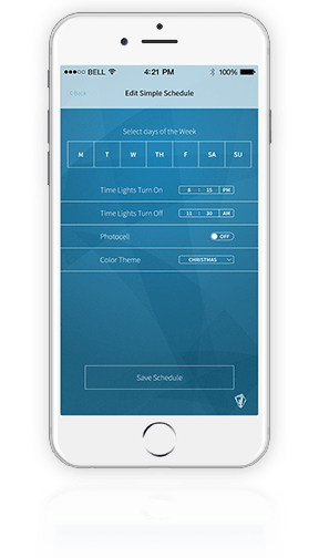 Using the exclusive Light Stream™ app for Iphone, Easily schedule which days and time you’d like the lights to turn on / off. In addition to your new simple scheduling, you can set which theme or color your lights will be each day of the week.